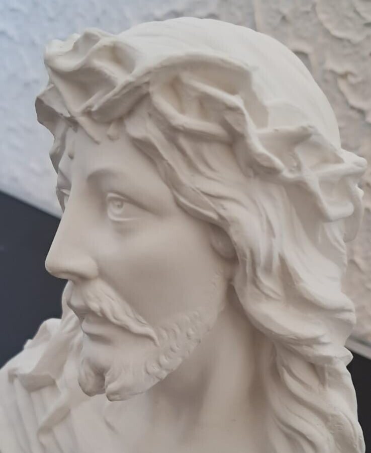 Ce buste représente Jésus-Christ portant la couronne d’épines, symbole de son sacrifice et de son amour pour l’humanité. La finesse des détails, du visage expressif aux contours de la couronne, invite au recueillement et à la méditation.