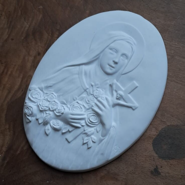 Ce médaillon de Sainte Thérèse de Lisieux symbolise la dévotion et les prières continuelles de la sainte. Les détails des roses et de la croix rappellent ses vertus et sa mission spirituelle. Placé sur un mur, il crée un point focal de recueillement et de méditation, inspirant les fidèles à la prière quotidienne.