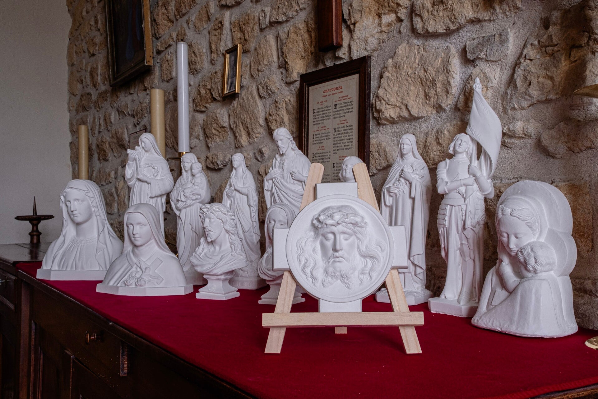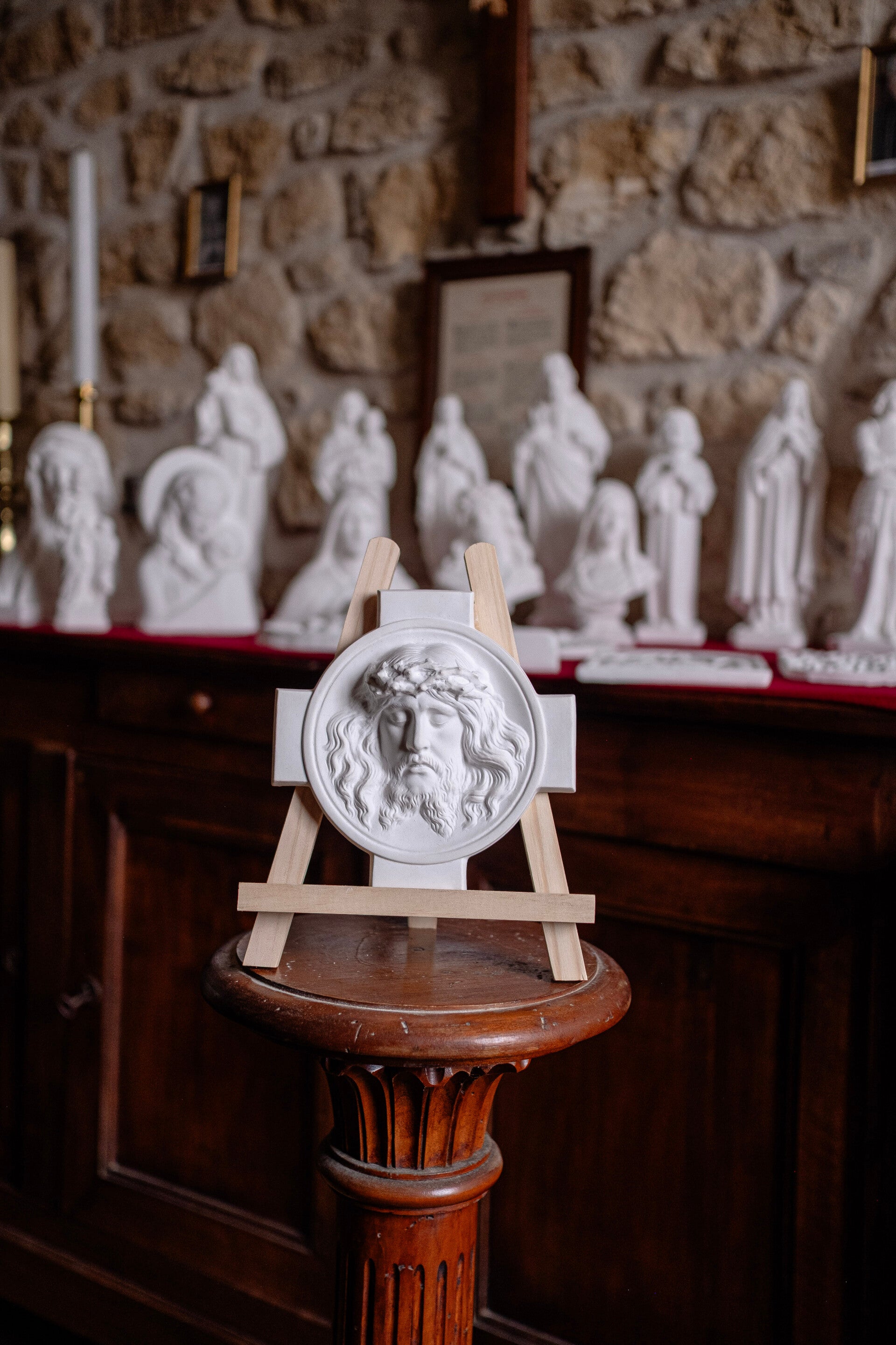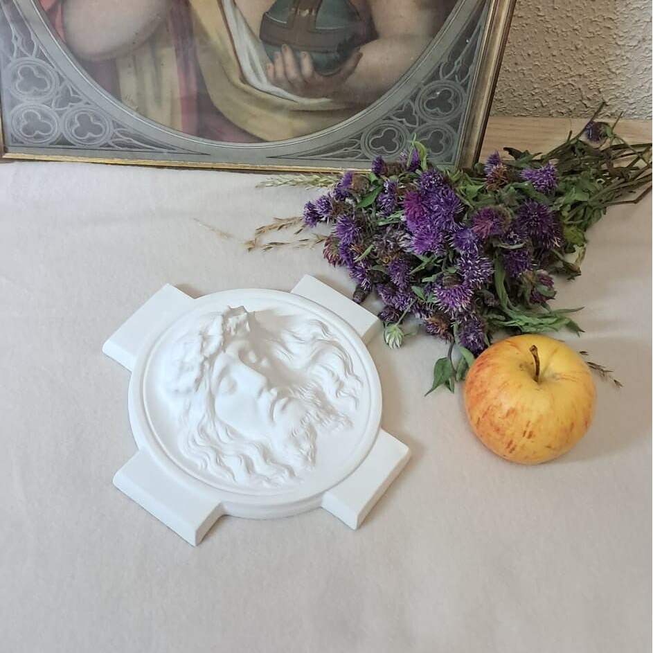 Ce bas-relief du Christ à la couronne d’épines capture la passion et le sacrifice du Sauveur. La finesse du relief permet à la lumière de faire varier les ombres et les expressions, créant un effet visuel émouvant et inspirant.