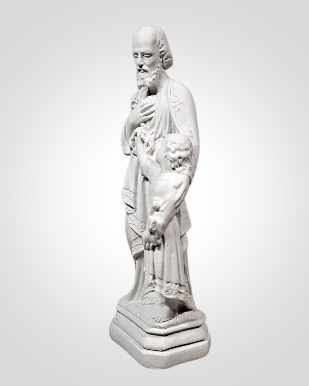 Cette représentation en plâtre statuaire blanc met en lumière la relation intime entre le père adoptif et l’Enfant, à travers des gestes simples et une expression pleine de douceur. Le choix d’un fini mat, proche du biscuit de porcelaine, renforce le caractère apaisant et spirituel de la statue.